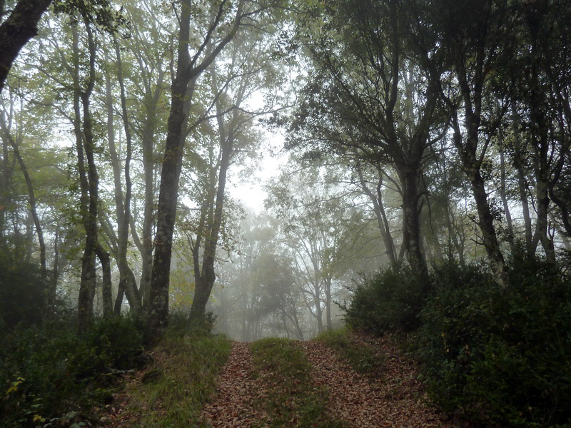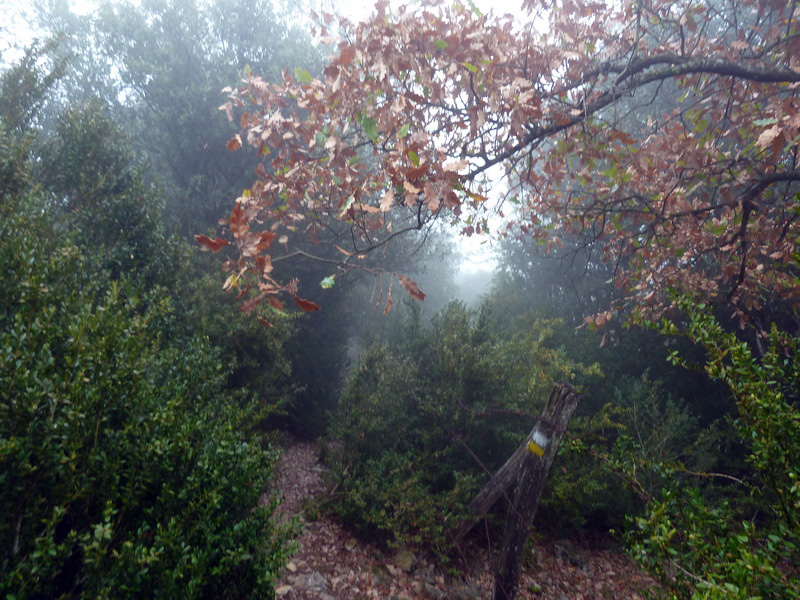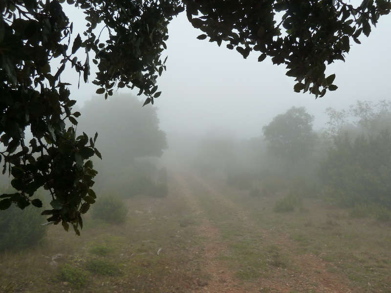 La niebla hace acto de presencia antes de llegar al collado, donde giramos a la derecha.