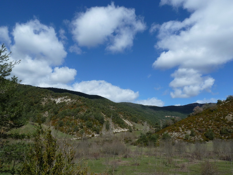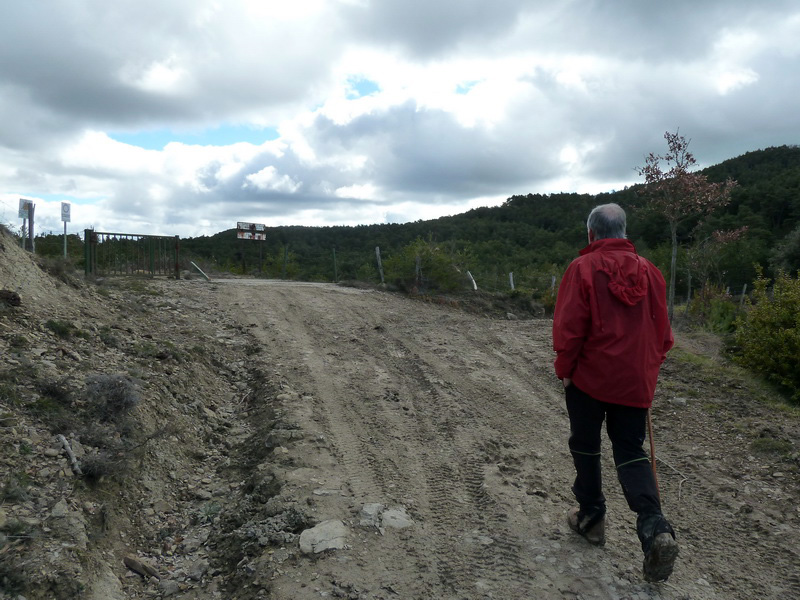 Bordeamos la primera loma por la pista que da otro rodeo y sale a un collado donde empieza a bajar. Entonces tomamos el cortafuegos.