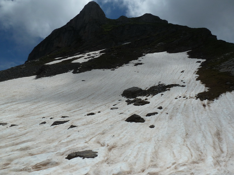 Llegamos al collado. Estudiamos la ruta. Subiré por la derecha del nevero para acercarme después a la barrera rocosa que se antoja antes de la cima.