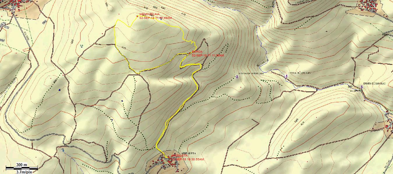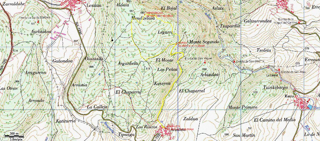 10:30. Aparcamos al lado de la iglesia de Arizaleta (663m) y salimos al norte.