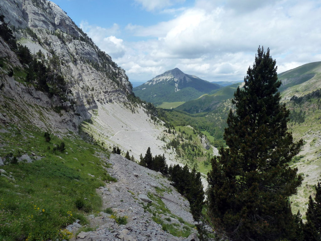 Y para la bajada nos inclinamos por el camino de la senda de Camille, balizado con pintura verde y amarilla.